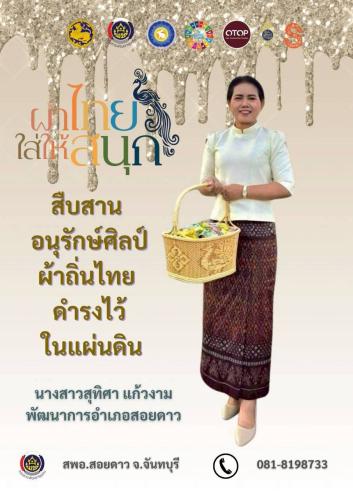 สำนักงานพัฒนาชุมชนอำเภอสอยดาว เชิญชวนสวมใส่ผ้าไทย ในทุกๆโอกาส ภายใต้แนวคิด "ผ้าไทย ใส่ให้สนุก" ร่วมสืบสาน รักษา และต่อยอด พระราชปณิธานของสมเด็จพระนางเจ้าสิริกิติ์ พระบรมราชินีนาถ พระบรมราชชนนีพันปีหลวง ในการอนุรักษ์ผ้าไทย และงานหัตถศิลป์